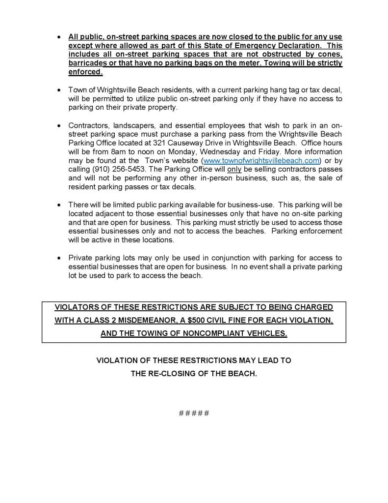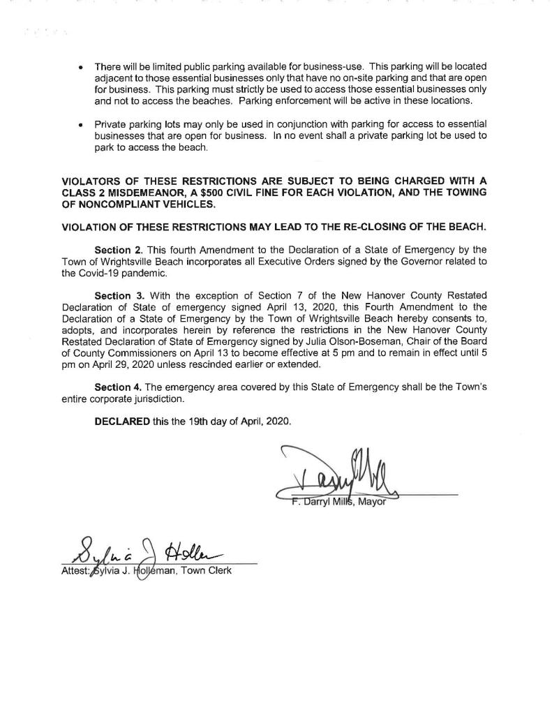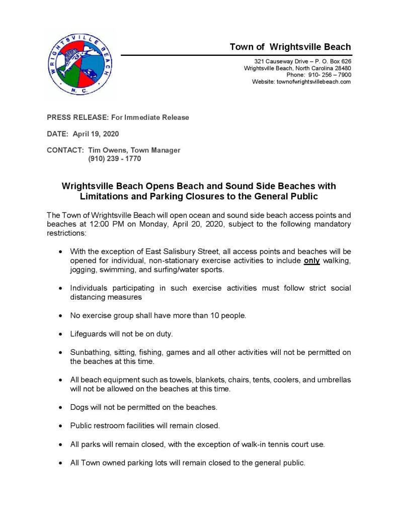Town Leaders in Wrightsville Beach issued a press release and proclamation re-opening it’s beach strand beginning Monday at Noon. To enjoy the sand, one must be in movement, walking or exercising. Popular beach activities such as fishing, sunbathing, “games”, dogs, or any related equipment will not be allowed on the beach. All Town owned parking lots will remained closed. There will be limited parking available for commerce, but the order specifically states that these public parking areas shall not be used as parking for beach goers. More exact parking rules can be found in the release for those that will need visit. See the actual documents below.