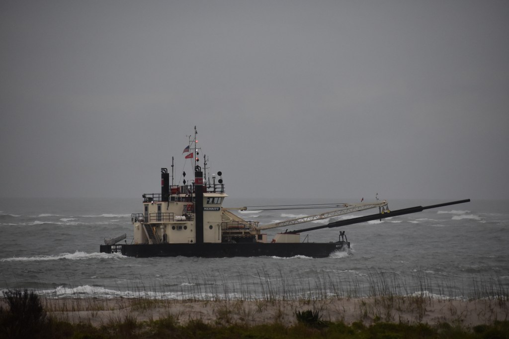 For the past week the Army Corp of Engineers have been conducting regular maintenance dredging of the New River Inlet. Historically the navigable channel here has been shifting, filling, and sliding around, causing a headache for those who traverse it. Some years it takes a more northerly track, but right now it is trending straight out to sea. The inlet sees the Merritt work about twice to three times a year, depending on workload caused by other inlets in our area. Shrimpers, Fishers, and Boaters of walks of life use this inlet daily. The Merritt is a side casting dredge to simply pumps sand up off the seafloor and deposits its to shoulder of the channel. Last year the Inlet was reinforced by an additional Hopper dredge. The Hopper dredge pumps a slurry of sand into its holds and then relocates it, in this case, about a quarter mile south of the mouth of the river. Thanks to the Army Corp. of Engineers for keeping out front door to the Ocean open. A fresh catch, a great day on the Ocean, and many jobs are only possible with an open inlet.