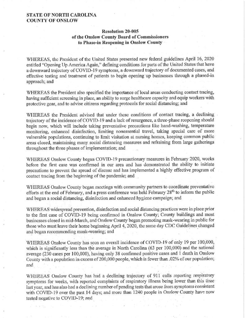 Monday evening the Onslow County Board of Commissioners unanimously adopted a resolution to Phase-in Reopening of the County. Mostly citing statistics and urging the State to follow Federal guidelines, No restrictions were lifted nor were any new ones enacted, by the resolution. Resolutions like this are normal business for local boards. Often put out out in support of one side or another in a social debate. No laws, regulations, or ordinances were established by this Resolution. Read the document itself below.