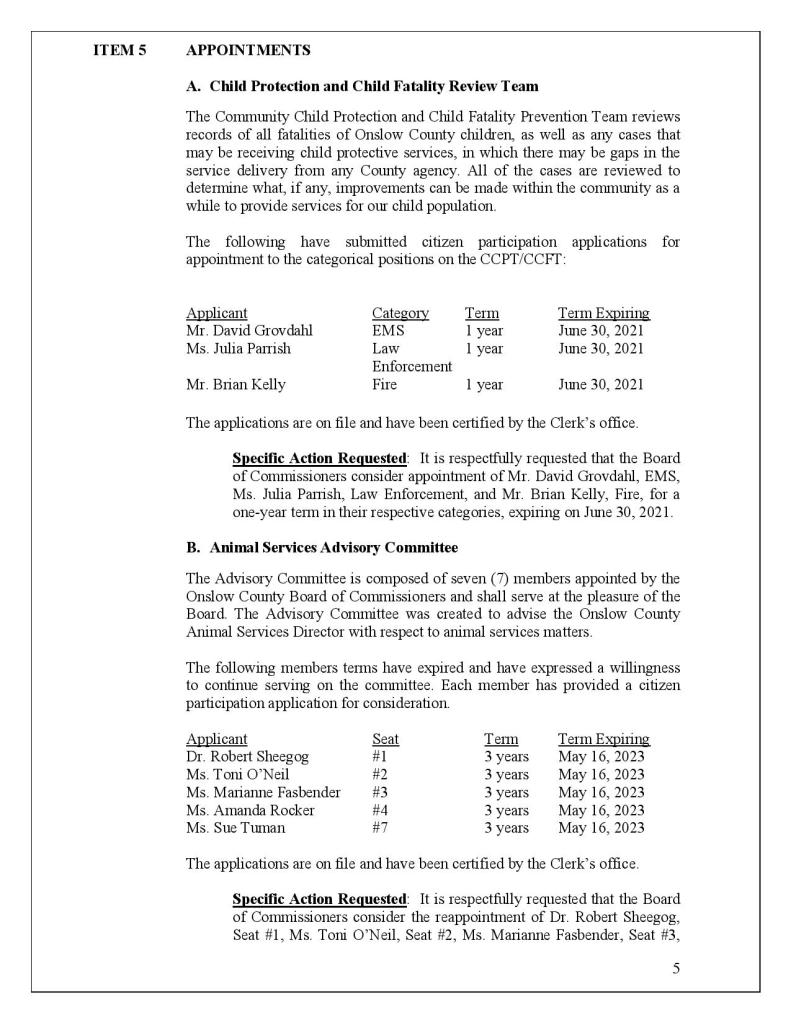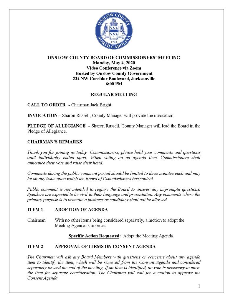The Onslow County Board of Commissioners released the agenda for it’s regularly scheduled May meeting. The meeting can be seen online live, at 6:00 pm Monday May 4th, here. https://www.onslowcountync.gov/385/Meetings