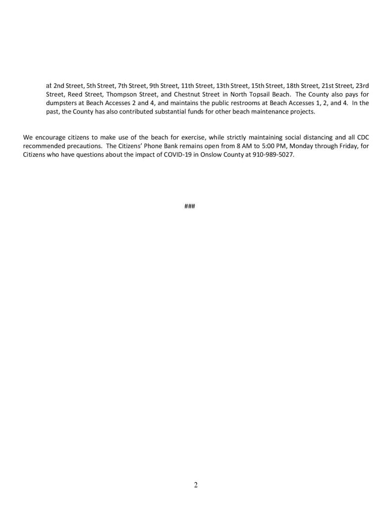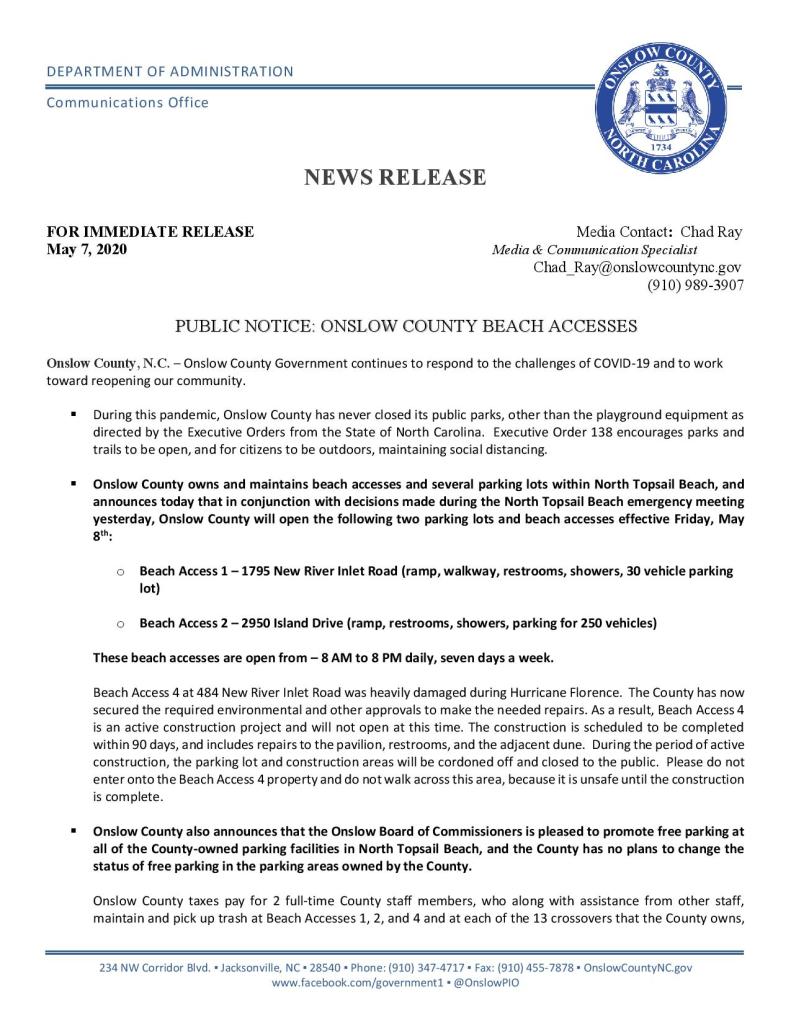 Onslow County plans to reopen the Beach accesses it maintains in North Topsail Beach on Friday, May 8. In a press release on Thursday the County announced it will reopen parking, ramps, and restrooms at access #1, 1795 New River Inlet Rd, and #2 at 2950 Island Drive. Citing Executive Order 138, which encourages parks to reopen, The County has provided an outlet for outdoor activities to resume on the beach strand. Open from 8:00 am to 8:00 pm daily with free parking, the accesses can be easily seen from the road. The press release provided by the County is below.