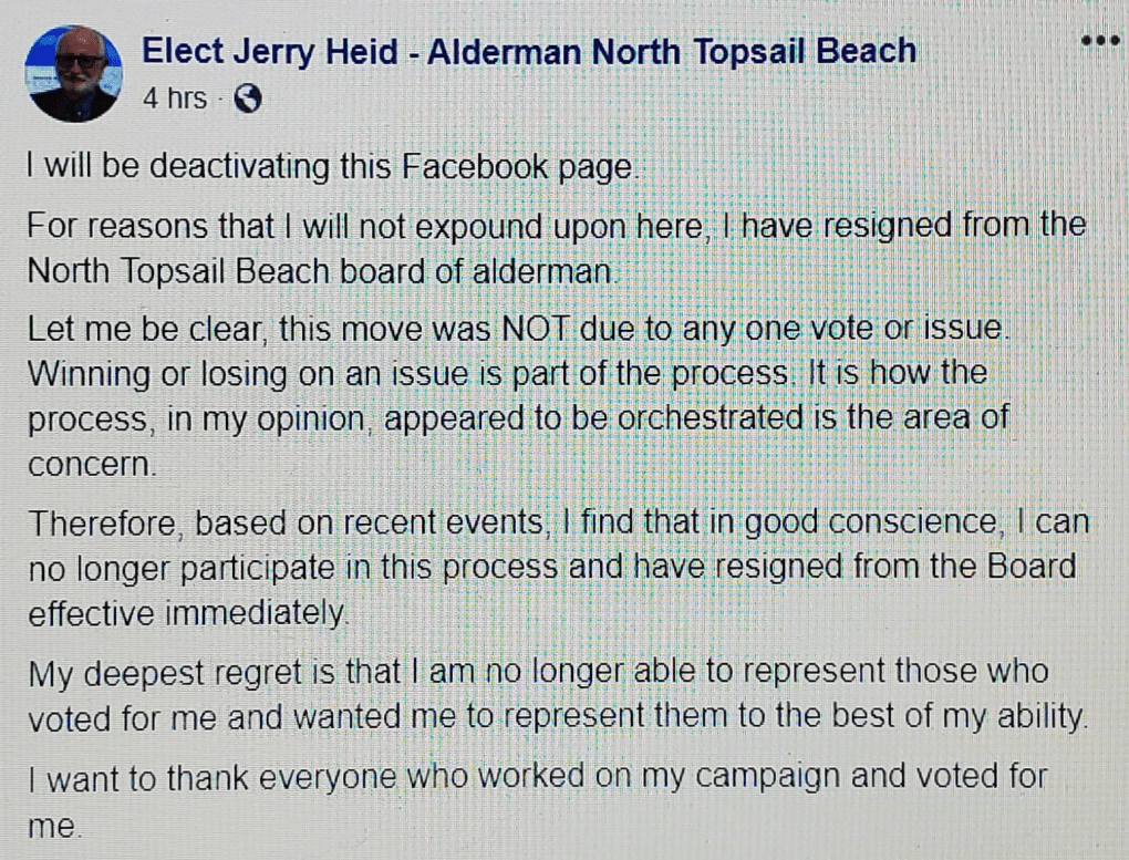 In a facebook post on Saturday, recently elected Alderman Jerry Heid resigned his seat on the Board.
